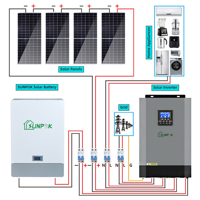 The sunpok energy hybrid solar system kit home solar storage system solution adopts a high-efficiency system design. The energy storage unit adopts a standardized energy storage module composed of deep-cycle lithium-ion batteries. The photovoltaic array and energy storage unit can be flexibly expanded to meet user needs. Intelligent storage can control integrated design, the system is simpler and more reliable.